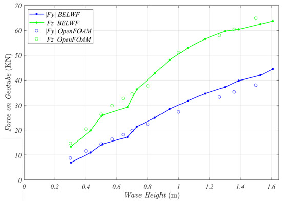 A comparison of the wave forces applied to the Geotube, versus wave height; between BELWF and OpenFOAM.