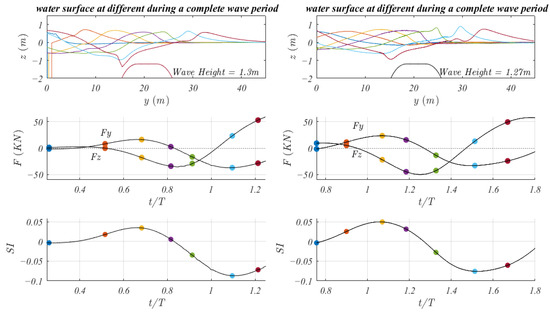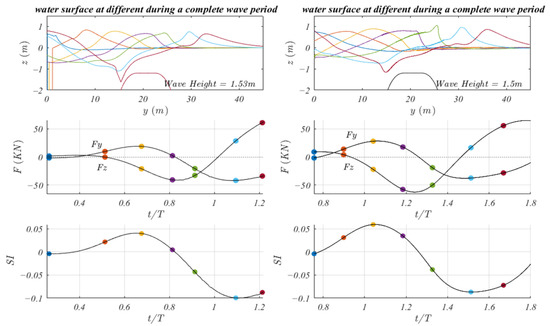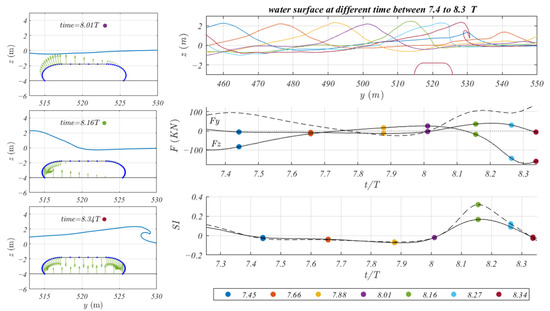Figure 11 presents the free surface elevations, the horizontal and vertical wave loads and the SI (at the right), as well as diagrams of the hydrodynamic pressure acting on the Geotube at representative times (at the left). The dashed black lines show the modified vertical load and the associated SIc, which assumes the induction of the hydrodynamic pressure along the contact line between the Geotube and the seabed.