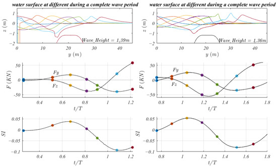 The results imply that the critical SI, or SIc, is obtained just before the wave breaks (the green water surface elevation, which corresponds to the green dots on the diagrams of forces and SI). This inspection makes it practical to assess the sliding stability of the structure by Lagrangian BEM and specifically our model BELWF. As there is no guarantee that the dynamic pressure does act on the Geotube’s bottom, the extreme value, between the two values of the SI, the solid line, by Equation (3), and the dashed line, SIc, by Equation (5), should be taken into account. A negative S, or SIc, means a friction coefficient, which is needed to prevent sliding, in the up-wave direction ().