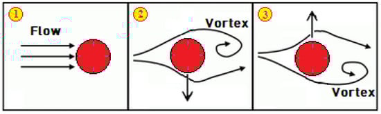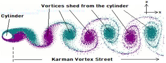 Vortex induced vibration is a form of flow induced motion whereby a body becomes excited, with vortices shed from its surface. It is notorious for its tremendous damage in engineering applications in many different fields, as it can devastate mega structures such as skyscrapers, bridges, offshore platforms, etc. Leonardo Da Vinci’s Aeolian Tones is the first known application of VIV which dates back to the start of the 16th century [20]. Ever since, engineers have been trying to suppress this destructive phenomenon. Imagine a stationary cylinder in a fluid. When the cylinder is exposed to a flow (in the +x direction in Figure 1), vortices shed. These vortices separate from the surface of the cylinder forming the famous Karman Vortex Street in the wake zone, which can be seen in Figure 1.