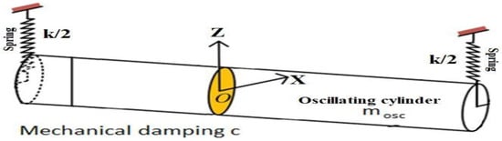 where mosc represents the total oscillating mass (all moving parts including one third of spring mass), c the mechanical damping, k the total spring stiffness and the Ffluid(t) force applied on the cylinder by the fluid. Z(t) is the vertical displacement of the cylinder and its derivatives and are its velocity and acceleration, respectively. , , and Ffluid(t) are functions of time, as the notations imply. As the fluid continues to flow, it generates Ffluid(t) on the cylinder which leads to continuous cylinder oscillation.