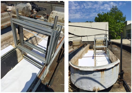 In the context of the study, VIV setup was implemented to a raceway pond with 3 m channel length and 1 m total channel width as shown in Figure 4. VIV cylinder is positioned at 1.3 m downstream of the paddlewheel. VIV Setup consists of oscillator particulars, which were selected with respect to pond depth. Cylinder diameter should be around 1/5 of the water depth at maximum [2], so that it can move freely without any interference from the free water surface or the bottom wall. Thus, cylinder diameter (D) was set as 0.06 m as experiments were held in water level of 0.3 m and flow velocity of U = 0.3 m s−1 (12 rpm paddlewheel velocity) to reflect realistic conditions. A general illustration of the system and its details are shown in Figure 4. Oscillator particulars installed in the pond consist of a cylinder, reels, springs, reel beddings and a frame that beddings are mounted on, as shown in Figure 4 and Figure 5. The cylinder is connected to reels via an aluminium lamellar, on which the reel is mounted. Same of the lammelars are in turn connected to springs.