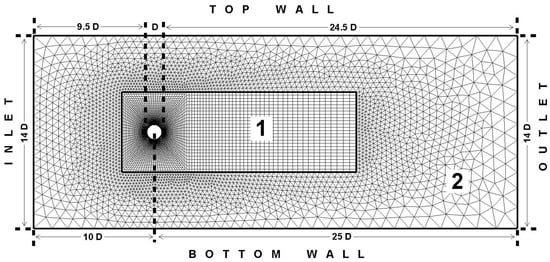 - The first domain is called the moving domain and surrounds the cylinder. The mesh is structured in this region and the elements are quadrilateral. The size of this inner rectangular domain is 17D × 6D. Number of elements in this region is around 7000.
