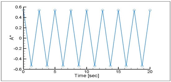 Cylinder oscillation of A* = 0.54 was achieved experimentally, which means the cylinder covers 6.5 cm in the vertical direction through the pond depth, with a frequency of 1.24 s−1. In Figure 8, y axis shows the amplitude response of VIV system obtained experimentally, while x axis shows data points captured by Arduino. Pan et al. [31] obtained similar A* responses at U* values near 5, while Khalak and Williamson [32] and Wanderley et al. [33] reached A* = 1 in same U*. On the other hand, Duranay and Kinaci [24] observed A* values higher than 1 at U* = 3. Furthermore, Kinaci [23] obtained A* > 1 at U* = 5. Different amplitude responses arise from flow characteristics, as well as difference in oscillator particulars such as cylinder diameter and oscillating mass.