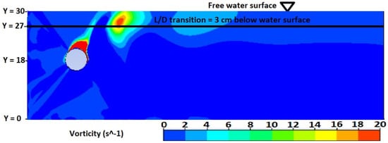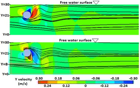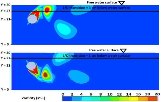 Contours in Figure 9 were captured when the cylinder is at its neutral position (see Figure 6), moving up (below contour) and down (above contour). Center of the cylinder is at Y = 21 cm for a 30 cm deep RWP. As can be observed from Table 3, similar input parameters, amplitude and oscillation frequencies obtained with numerical simulation and experiments were in good accordance. Thus, it is believed that numerical simulations can be used to visualize the flow to gain insight into the physical aspects associated with vertical mixing.