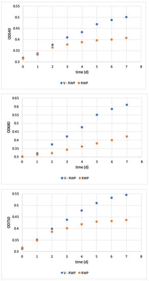 Growth of Chlorella vulgaris in V—RWP and conventional RWP monitored at three wavelengths; 540 nm, 680 nm and 750 nm.