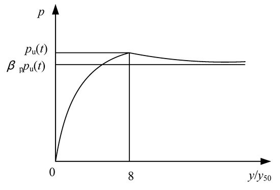 In the initial stage, the soil resistance increases nonlinearly with the increase in the y/y50. When the soil resistance reaches the peak value, the soil resistance decreases with the increase in the y/y50, and gradually approaches βppu(t). The relationship between p/pu(t) and the y/y50 can be calculated as: