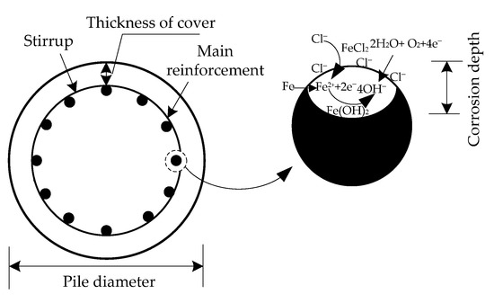 When a reinforced concrete pile is constructed in coastal areas, the steel bar in the pile is easily corroded by chloride. Consequently, the bending stiffness of the pile will deteriorate and decrease. The corrosion mechanism of chloride can be described, as shown in Figure 3. In order to consider the influence of chloride corrosion on the bending stiffness of the pile, the bending stiffness (EI) of the pile can be corrected by adding a reduction factor η [1].