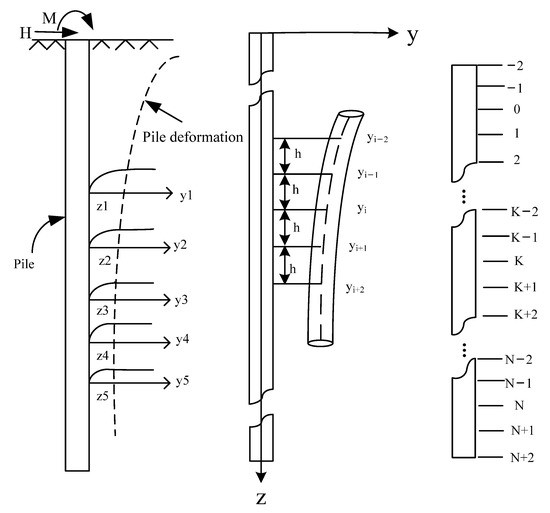 According to the distribution of soil condition, the pile is divided into N sections, and two virtual nodes are added at the position of the top and bottom of the pile using the principle of central difference method. The deformation and difference diagram of the pile under horizontal load is shown in Figure 4.