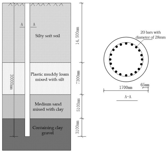 A reinforced concrete pile is constructed in soft clay in a coastal city. The soil depth is 40 m. The physical and mechanical properties of the foundation soil are shown in Table 1. C30 concrete is used for constructing the pile. The length of the pile is 30 m, the diameter of the pile is 1.7 m, and the elastic modulus of the pile is 30 GPa. Twenty steel bars (HRB400) with a diameter of 28 mm are used as the main reinforcement. The concrete cover is 65 mm. The horizontal load is 150 kN, the initial bending moment is 420 kN·m, the ultimate bearing capacity of the pile is 30,352 kN·m, and the maximum allowable displacement of the pile is 10 mm. The reinforcement of the pile is shown in Figure 5.