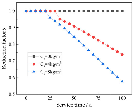 As shown in Figure 6, a similar attenuation law of pile bending stiffness is created by different environments. When the critical concentration of chloride on the surface of the steel bar is 0.65 kg/m3 [30], the initial corrosion time of the pile is the 34th year and 22nd year with the conditions of chloride concentration of 4 kg/m3 and 8 kg/m3, respectively.