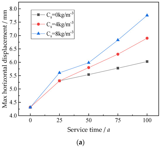 As shown in Figure 7, the horizontal displacement of a pile increases with service time. Taking the chloride concentration of 8 kg/m3 as an example, the initial horizontal displacement of 4.3 mm increases to 5.4 mm, 6.1 mm, 6.8 mm, and 7.8 mm, at the service times of 25 years, 50 years, 75 years, and 100 years, respectively. The displacement increases by 81.4% in the 100th year. Furthermore, the greater the chloride concentration on the pile surface, the greater the horizontal displacement. When the service time is 50 years, and the chlorine ion concentration of the pile surface is 0 kg/m3, 4 kg/m3, and 8 kg/m3, the corresponding horizontal displacement is 5.5 mm, 5.8 mm, and 6.0 mm, respectively.