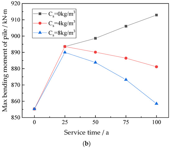 When the chloride concentration is 0 kg/m3, the maximum bending moment of the pile increases with the increase in service time. If the maximum bending moment at the initial state is 855 kN·m, at the service time of 25 years, 50 years, 75 years, and 100 years, that changes to 894 kN·m, 899 kN·m, 06 kN·m, and 913 kN·m, respectively. The maximum bending moment increases by only 6.7% after 100 years of service.