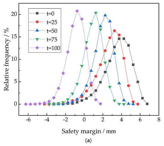 In order to explore the influence of pile–soil time-varying characteristics on the safety margin frequency distribution, a total of 4 × 104 groups of random variables obeying the normal distribution were extracted and substituted into the limit state function expression. The frequency distribution curve for horizontal displacement failure mode is shown in Figure 8.