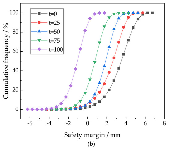 It can be seen from Figure 8 that the safety margin frequency distribution of horizontal displacement is significantly affected by the time-varying characteristics of the soil. Compared to the PDF curves with a service time of 0 years and 100 years, the coverage range of the safety margin changes from 2–6 mm to −3–1 mm, and the relative frequency corresponding to the extreme value gradually increases. It can also be summarized from the CDF curve that the longer the service life, the lower the safety margin at the same cumulative frequency, which also indicates the declining law of the reliability index of the pile.