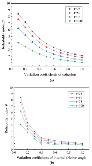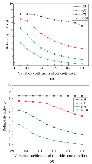 Influence of the variation coefficient of a parameter on the reliability index. (a) Relationship curve between cohesion and time-varying reliability. (b) Relationship curve between internal friction angle and time-varying reliability. (c) Relationship curve between the concrete cover and time-varying reliability. (d) Relationship curve between chloride concentration and time-varying reliability.