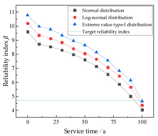 When the shear strength index obeys the normal distribution, the log-normal distribution, and the extreme value type I distribution, the reliability index decreases to 5.56, 5.83, and 6.14, respectively, after 100 years of service. This indicates that the reliability index is impacted obviously by the distribution pattern of the random variables. When the shear strength index obeys the extreme value type I distribution, the calculated reliability index is greater than that of log-normal distribution and normal distribution during the service life.
