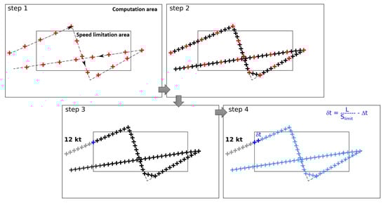 Speed limitation acts in two different ways: by reducing the source levels (according to RANDI models) and redistributing the sources in space and time. In this study, SR is simulated by modifying the AIS dataset in terms of speed and ships routes, in accordance with a speed limitation policy inside a selected SLA. The four steps that permit the creation of a modified AIS dataset are described below and illustrated in in Figure 1.