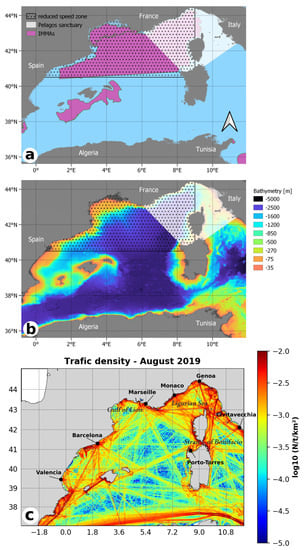 Regulated area, area of importance for marine mammals (a), bathymetry (b) and traffic density map for the month of August 2019 (c) in the Western Mediterranean Sea speed limitation area.