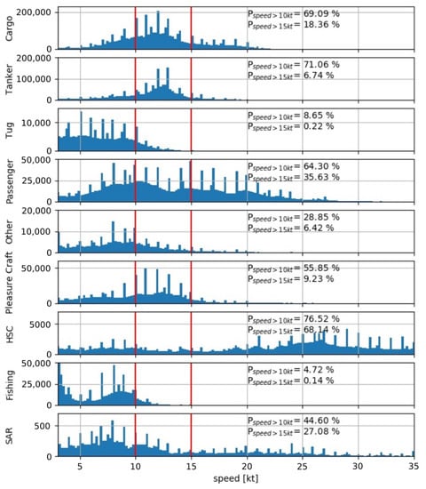 Distribution of speeds as indicated in the AIS emissions within the AIS dataset for the western Mediterranean Sea during the month of August 2019 for the most present vessel categories.