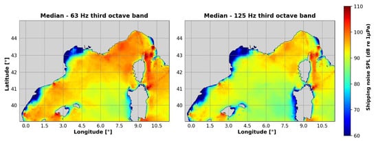 Monthly median shipping noise on the third-octave bands centered on 63 and 125 Hz in August 2019 in the western Mediterranean zone (maximum over the water column; resolution, 5 arc min).