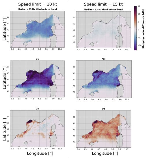 The shipping noise maps were computed in the reference case and in the two cases of speed limitation (15 and 10 kt) for each 6 h time windows. For the reference case, Figure 4 presents the maximum of the median shipping noise within computed depths over the experimental period for the third octave frequency bands centred on 63 and 125 Hz. The median, as well as the first and third quartiles of the distribution, is presented in the case of speed limits of 10 and 15 kt in Figure 5. In the case of a speed limit at 10 kt, the median shows a negative central tendency for the value (from zero to −6 dB depending on the location), indicating that the measure generally produced a decrease in shipping noise (as in the first set of experiments).
