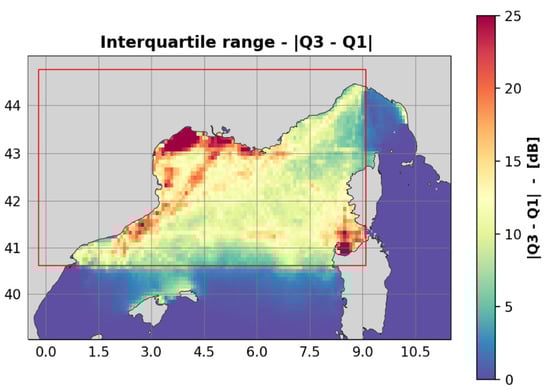 The third indicator aims to assess the stability of the effects of the measure. This is explored through the spread of the distribution of , which is quantified by the interquartile range in dB, as it is robust to extreme values. In Figure 7, the interquartile range is represented for the third-octave frequency band, i.e., 63 Hz. Most of the area appears within an interquartile range of between 5 and 10 dB. A few zones are characterized by higher interquartile ranges, reaching 25 dB: major shipping routes, the Portos Torres area and the Gulf of Lion.