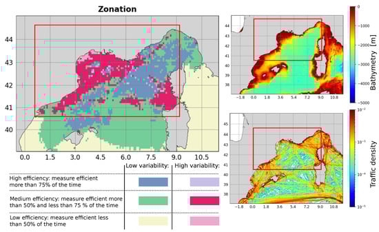 Distribution of zones of high variability and low variability of the measure in relation to the local median effectiveness (left), bathymetry (top right) and traffic (bottom right) in the western Mediterranean Sea. The zone of traffic reduction is delineated in red.