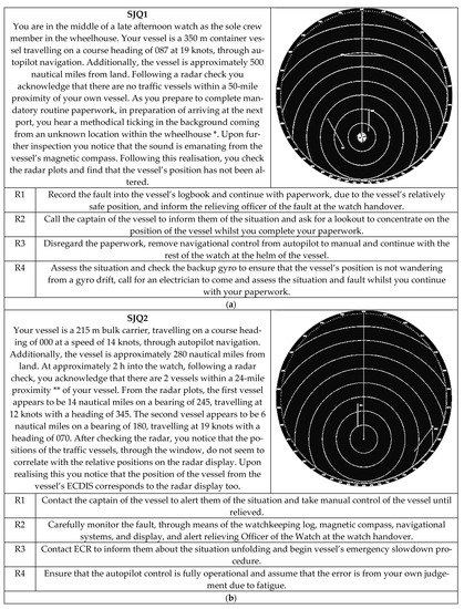 Each of the situational judgement questions (SJQ) described a scenario that would have the participant act as the officer of the watch. From the description of each scenario, candidates would be able to gain an understanding of the vessels’ position, speed, and surroundings. Additionally, within each SJQ, participants would encounter a fault that would then prompt them to analyse and rank the responses from 1 to 4.