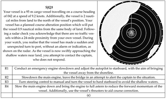 Figure 2a–c shows the scenarios and resultant responses for the respective SJQs. The aim of SJQ1, shown in Figure 2a, was to give the participant a scenario representative of that found in a study conducted in 2021. Using a bridge watchkeeping simulator, it was found that navigational officers found difficulties in recognising an automation fault; therefore, by recreating a similar scenario, the aim of this question was to gain an understanding whether, if presented with a scenario such as the one found in Figure 2a, candidates would react appropriately by selecting a suitable response to an automation fault. Subsequently, SJQ2, shown in Figure 2b, was designed with the aim of giving the participant a mechanical fault. By designing a scenario that is a replication of a past research study scenario, it may then be possible to gain an insight into the knowledge level of seafarers, i.e., “Is there a skill gap among seafarers in being able to apply their knowledge to a real-time event or do the seafarers have a lack of knowledge regarding the situation?”. The design of SJQ3, shown in Figure 2c, closely resembled the events of the grounding of the Lauren Hansen [5]. By reviewing the various maritime accidents, it was possible to identify various incidents where the choices that resulted in the accident occurring may be construed as the most unbelievable answer when presented in text to a participant.