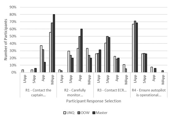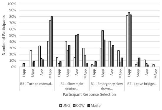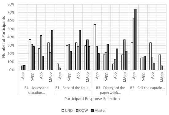 As shown in Figure 3, the consensus among the participants was that R4 (“Assess the situation…”) would be the least appropriate response. However, R1, R2, and R3 showed a greater disparity, despite R1 being the popular choice for most appropriate response. When analysing the responses based on rank, it can be seen that for participants of Master level the commonly selected choices for “Most Appropriate” and “Least Appropriate” were R1 and R4, respectively. Whereas the OOW group favoured R2 as the “Most Appropriate” response and R4 again as the “Least Appropriate” response. Conversely the unqualified officers group favoured R1 as the “Most Appropriate” response and R3 as the “Least Appropriate”.