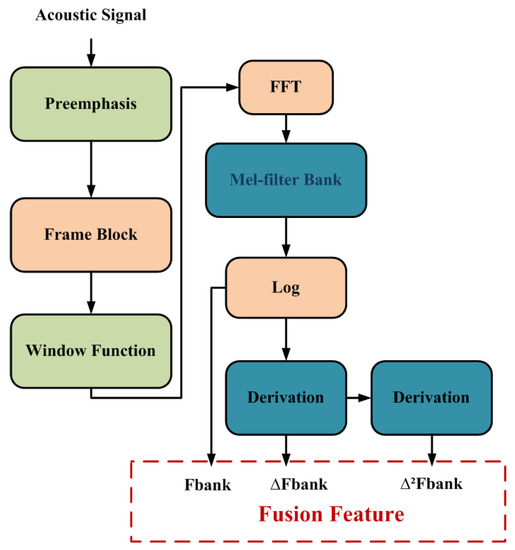 In subsequent experiments, the fusion spectral future can be expressed as . Here, C represents the dimension of the spectral feature, F represents the number of Mel filters in the frequency dimension, and T represents the length of the output in the time dimension. We show the fusion feature extraction pipeline in detail in Figure 2.