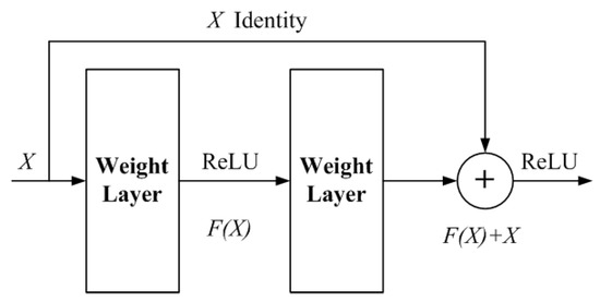 As the network becomes deeper and deeper, the training becomes harder and the optimization of the network becomes more and more difficult. In theory, the deeper the network, the better the effect should be; however, in fact, due to the difficulty of training, the network that is too deep will cause degradation problems, and the effect is not as good as the relatively shallow network. When it is stacked to a certain network depth, a vanishing gradient or exploding gradient problem may appear. As the network becomes deeper in underwater acoustic target recognition, problems as previously mentioned can be mitigated by adding by adding a residual module [21]. The residual module adds short connections based on a single connection method. Short connections can span several layers, even are added to the input to directly map the input to the output, so as to avoid neural network degradation. Figure 3 shows the basic structure of the residual module, and we use ResNet18 as the network architecture to implement VFR.