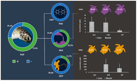 Percent frequency of detection of POPs and average levels in the tissues of green sea turtles Chelonia mydas. Adapted from Yaghmour et al. []. With the permission of Elsevier.