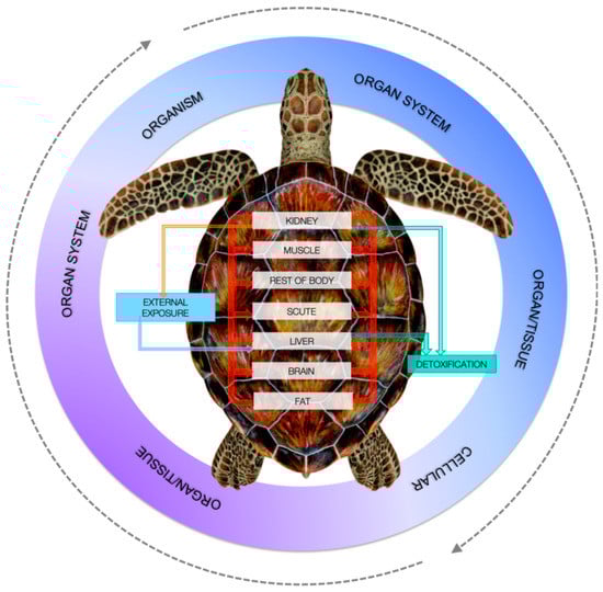 In the case of metals, one of the most threatening elements is chromium, which can be highly toxic for turtles besides humans. Chromium is considered as one of the main marine global metal contaminants that can have toxic impacts across species []. Speer et al. [] studied the cytotoxicity and genotoxicity of particulate Cr(VI) in humans and leatherbacks lung fibroblasts and found that particulate Cr(VI) induced cytotoxicity in leatherback cells comparable to human cells. Kaska et al. [,] considered that HMs in turtle tissues are likely to affect the health of loggerhead turtles in the Mediterranean. The reason why PPs pollutant health effects need to be investigated more deeply lies in the difficulty to set up exposure threshold limits, which are largely lacking []. Dogruer et al. [] studied the effects of Cd in green sea turtles to test a mechanistic model named physiologically-based kinetic (PBK) to test contaminant risk assessment. The model was built on species, chemical lifetime bioaccumulation, in vitro and in vivo toxicity threshold assay, and chemical risk quantification (Figure 5). Seven targets were considered as kidney, muscle, scute, liver, brain fat, and the rest of body. As has been stated above, in the rest of body it can be included—for example, salt glands might possess outstanding enrichment power of PPs as PAHs []. Dogruer et al. [] revealed that Cd kidney toxicity was age-dependent and varied with physiology and feeding ecology, and set up a steady-state exposure threshold of 0.1 μg/g dry weight Cd in forages. Thus, even with some uncertainty, threshold limits can be set up. PCBs may affect the immune system of sea turtles, causing anaemia, hepatic damage, and immunomodulation [,,].