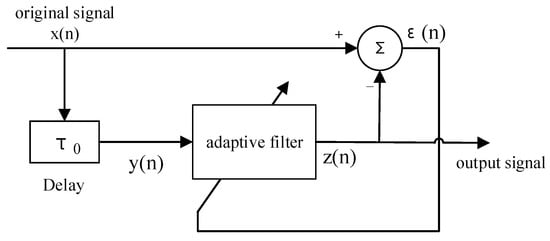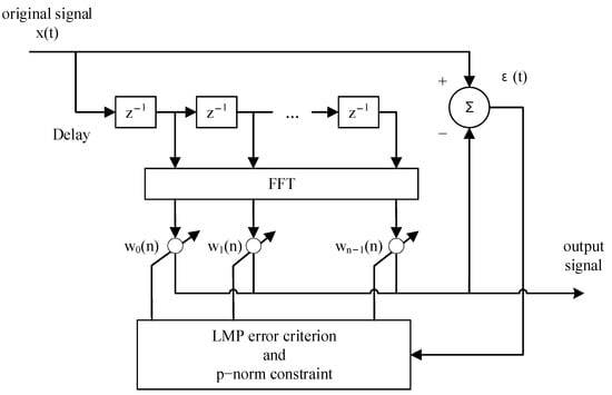 The LMP algorithm is applied on the adaptive filter to improve the SNR gain amid non-Gaussian noise []. The filter coefficients in the CALE are updated by Formula (5). When the noise model satisfies the Gaussian distribution, the adaptive filter in the CALE based on the LMS algorithm can easily narrow the estimated error. However, some sharp spikes with higher amplitude appear in the environment, and the update process of the filter coefficients will be disturbed by the suddenly large error . Under this circumstance, the cost function can be constructed using the p-order distance of the error expressed by