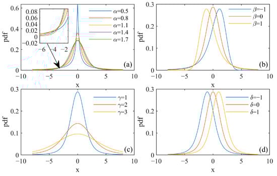 The characteristics of α stable distribution are affected by four parameters: , , and . These four parameters, respectively, determine the tail characteristics, deflection characteristics, dispersion characteristics and position characteristics of α stable distribution. is the characteristic parameter, which determines the tail thickness of the probability density function for a random sequence. is the skew parameter, which affects the symmetry of the probability density function. When , the distribution is symmetrical; when and , the α stable distribution is Cauchy distribution; and when , the random distribution becomes Gaussian distribution. The smaller the value of , the heavier the tail of the probability density distribution and the stronger the impulsivity of the random sequence. is the dispersion parameter, which is used to measure the deviation of the sample from the mean value. is similar to the concept of variance. is a position parameter and determines the offset degree of the probability density function on the x-axis.