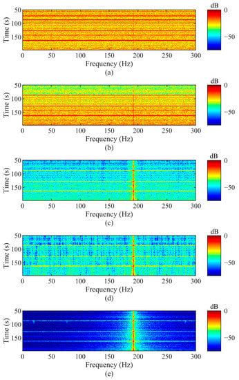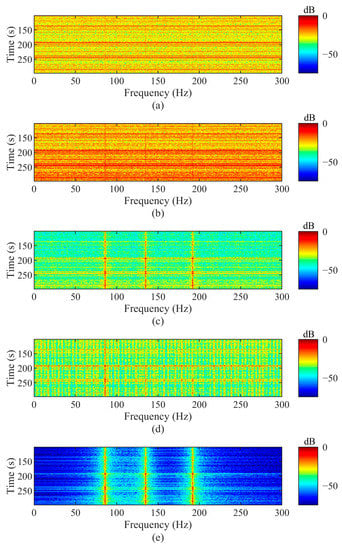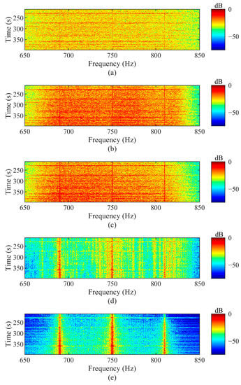 Figure 9a shows the original LOFAR diagram of the unprocessed signal with low SNR. The output SNRs of the PALE, SALE and PSALE were 2.5, 14.7 and 16.4 dB higher than that of the CALE, respectively. Figure 9e shows the processing result of the PSALE proposed in this paper. It can be seen that broadband noise and impulse noise were strongly suppressed, and the line spectrum at 750 Hz was obvious. The line spectrum in the PSALE was much clearer than those of the other ALEs.