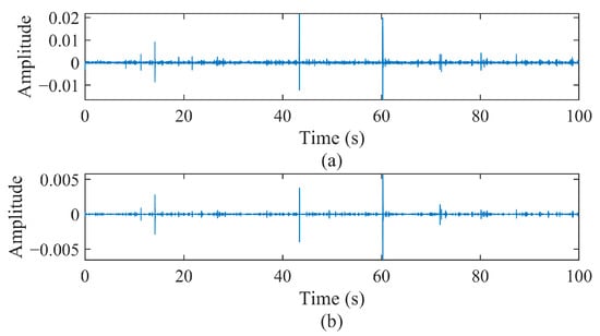 The formula for calculating the SNR under a non-Gaussian distribution is similar to the formula under Gaussian distribution. Assuming that the noise in the discrete time domain is , where is the time index, the signal not contaminated by noise is , and the signal length is ; then, the signal power is . We used the generalized SNR (GSNR) to measure the relationship between signal and noise. The formula for calculating the GSNR can be expressed by