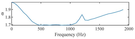 The under-ice noise data recorded at a depth of 95 m contained broadband noise with sharp bursts. The sampling frequency after downsampling was 4000 Hz. The noise data in the time domain and their LOFAR diagram are, respectively, depicted in Figure 6a and Figure 7. The results in Figure 7 show that the strong non-Gaussian impulsive noise was not averagely distributed in each frequency band. To determine the exact frequency band where the non-Gaussian impulse noise was distributed, we used α stable distribution to fit the under-ice noise to determine the fitting value of the parameter α in every frequency band. The fitting result is shown in Figure 8. From Section 4.1, we know that the smaller the parameter α, the stronger the non-Gaussian and impulsive characteristic. Therefore, signals in the frequency band with have stronger impulsivity. We chose the filtered noise signal between 650 and 850 Hz as the non-Gaussian environmental noise to verify the methods. The noise in this frequency band exhibited stronger non-Gaussian characteristics. The filtered noise data are shown in Figure 6b. Next, we analyzed the proposed PSALE performance in this frequency band and compared it with those of the three other ALEs amid impulse noise.