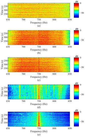 Next, we added the narrowband component into the filtered noise data to form the under-ice received data. The frequency of the tonal was 750 Hz, and the frequency band of the impulse noise ranged between 650 and 850 Hz. The time length of the signal was 200 s. The learning parameter was 5 × 10−12. The norm parameter was 1.1. The search interval of the parameter in the SALE was 2 × 10−22. The search intervals of the parameters and in the PSALE were 9 × 10−20 and 0.5, respectively. The LOFAR diagrams are depicted in Figure 9.