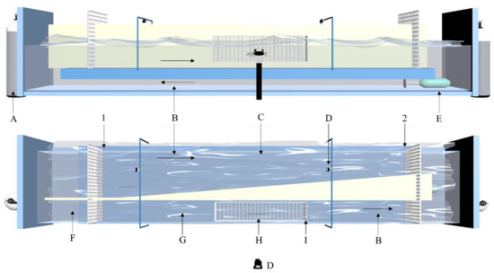 The experiment was carried out in a multifunctional two-body water tank (Figure 1, drawn by 3DMAX 2022, Autodesk, California, USA). The total length of the water tank was 17.13 m and it was divided into two tunnels. The two parts were isolated, each with a separate water flow speed. The cross-sectional area of channel C varies with location, serving as a site for the velocity preference test of fish. The cross-sectional area gradually decreases from 1 to 2, while the flow velocity increases, forming a stable flow velocity change. In Figure 1, the area was 80 cm × 80 cm at 1 and 20 cm × 80 cm at 2, and the flow velocity at 1 was the smallest. The cross-sectional area of channel G in the endurance swimming test did not change, the water flow speed was the same, and the cross-sectional area was 50 cm × 80 cm. Studies have shown that the choice of experimental equipment has a significant impact on fish swimming ability [22]. In the experiment, a metal cage was set up in a water tank to simulate the conventional cage culture environment, and an air pump was used to provide sufficient oxygen. Electric motors and mesh rectifiers generated a stable and uniform circulating water flow to test the swimming ability. The flow meter was placed at the center of the water channel with a 15 cm probe from the bottom of the water channels G and C (1 site) to measure the water flow speed in real time. We also set up 3 cameras to record the whole swimming process.