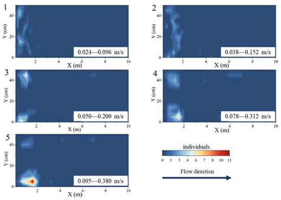 Distribution of large yellow croaker at 200 min. (1–5) in the figure represent the distribution of large yellow croaker under the five flow rate gradients respectively. The density of large yellow croakers are represented by different colors; the higher the degree of red, the denser the distribution of large yellow croakers.