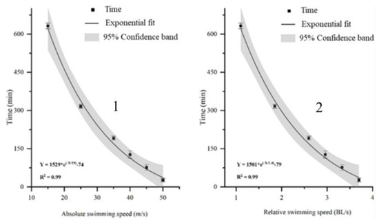 To assess the relationship between the sustained swimming time and flow velocity, we used absolute and relative swimming speed to describe the endurance swimming ability of large yellow croaker (Figure 3). The swimming time of large yellow croaker was significantly different at different flow rates (p < 0.05). Specifically, when the absolute swimming speeds were 0.15, 0.25, 0.35, 0.40, 0.45, and 0.50 m/s (relative swimming speeds were 1.10, 1.85, 2.60, 2.96, 3.33, 3.70 BL/s), the corresponding endurance swimming times of large yellow croaker were 631, 316, 191, 127, 76, and 27 min, respectively. According to the results, we used the power function for fitting analysis, and obtained the absolute swimming speed as and the relative swimming speed as .