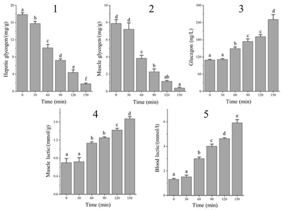 Metabolite concentrations at six time points in 0.35 m/s flow rate. In the same metabolism, values with different superscript letters indicate significant differences (p < 0.05). (1–5) are subfigures of changes in concentrations of five metabolites. (1): Hepatic glycogen; (2): Muscle glycogen; (3): Glucagon; (4): Muscle lactic; (5): Blood lactic.