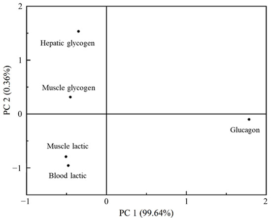 Five metabolite concentrations were analyzed using principal component analysis (Figure 5). The results showed that the first principal component (PC 1) significantly differentiated the concentration changes in glucagon compared with glycogen and lactate, while PC 2 significantly differentiated the changes in glycogen and lactate concentrations. During swimming, the concentration changes of the same metabolites were consistent, while the change trends of different metabolites showed obvious differences. Changes in muscle and blood lactate were grouped together, and so were muscle and liver glycogen, while those in glucagon concentration were not.