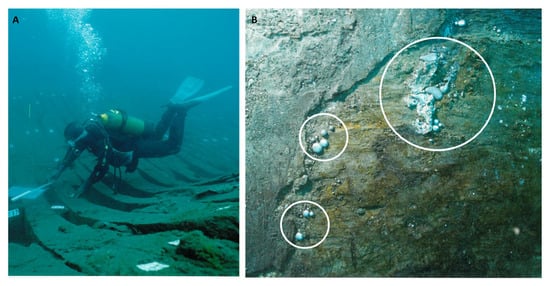 Images taken during the archaeological work survey of Angra Bay in Terceira Island, Azores archipelago: (A) underwater work during an archaeological survey in 1996 and (B) traces of elemental mercury found in the ship’s hull. Elemental mercury droplets are indicated with white circles. (Photo credit: Direção Regional de Cultura do Governo Regional dos Açores).