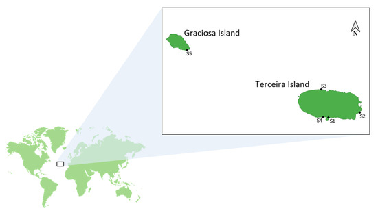 Location of the sampling sites in the Azores archipelago: S1, S2, S3, S4 (Terceira Island); S5 (Graciosa Island).