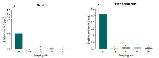 Regarding the mercury content determined in the different sediment fractions (sand and fine sediments) of the surface sediments, the mercury levels found in S1 were very high in both sediment fractions when compared with the mercury content in the sediment fractions from the other sampling sites (Figure 3). On average, the mercury concentration found in the sand fraction (Figure 3A) was 0.21 ± 0.01 µg g−1 in S1, 0.002 ± 0.0003 µg g−1 in S2, 0.002 ± 0.0008 µg g−1 in S3, 0.005 ± 0.003 µg g−1 in S4 and 0.002 ± 0.0003 µg g−1 in S5. At the same time, the mercury concentration in the fine fraction follows the same order as the concentration found in the sand fraction: S1 > S4 > S3 > S5 > S4 (Figure 3B). However, this mercury concentration is much higher than that observed in the sand fraction. The average mercury concentration found in the fine sediment fraction (Figure 3B) was 1.04 ± 0.004 µg g−1, 0.03 ± 0.001 µg g−1, 0.04 ± 0.002 µg g−1, 0.06 ± 0.001 µg g−1 and 0.03 ± 0.001 µg g−1 at S1, S2, S3, S4 and S5, respectively. The increase in mercury concentration in the fine sediment fraction was statistically significant (p < 0.05) in all sampling sites when compared to the mercury concentration present in the sand fraction of the same sampling site.