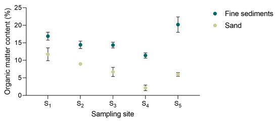 Organic matter content (%) in sand and fine sediment fractions from the different sampling sites in the Azores archipelago: S1, S2, S3, S4 (Terceira Island); S5 (Graciosa Island).